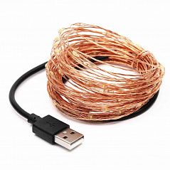 Нить "Роса" медь, 10 м х 100 диодов, от USB, теплый белый Нить "Роса" медь, 10 м х 100 диодов, от USB, теплый белый