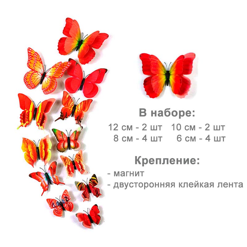 Бабочки выполнены из пластика, крепятся с помощью магнита, так же в комплект входит двухсторонняя клейкая лента.