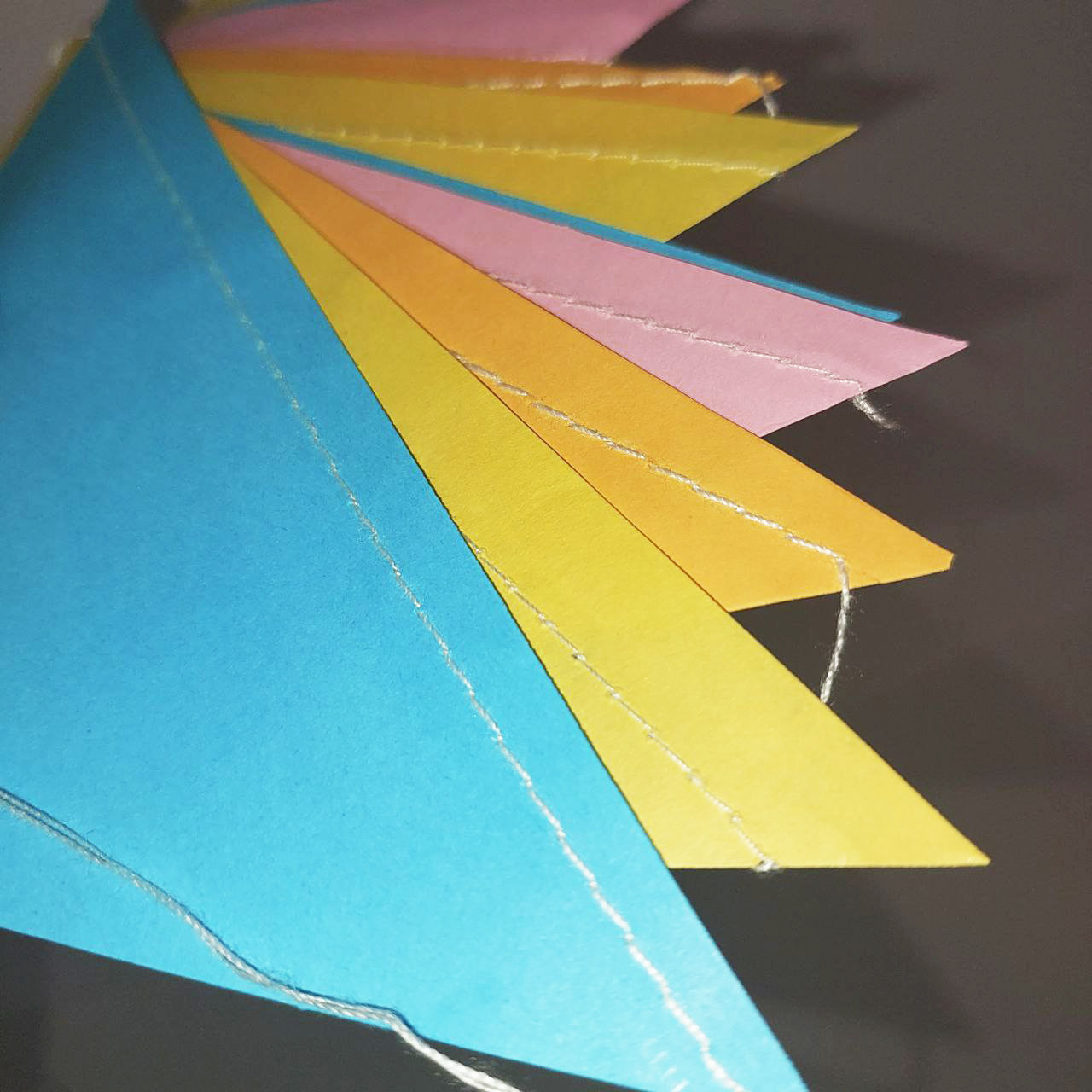 Декоративная гирлянда в форме вымпела, декорированная красочными бумажными двусторонними треугольниками.