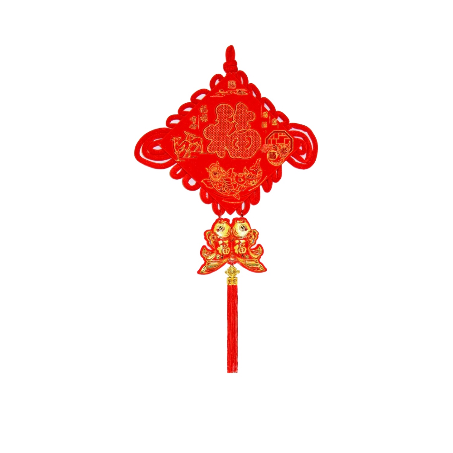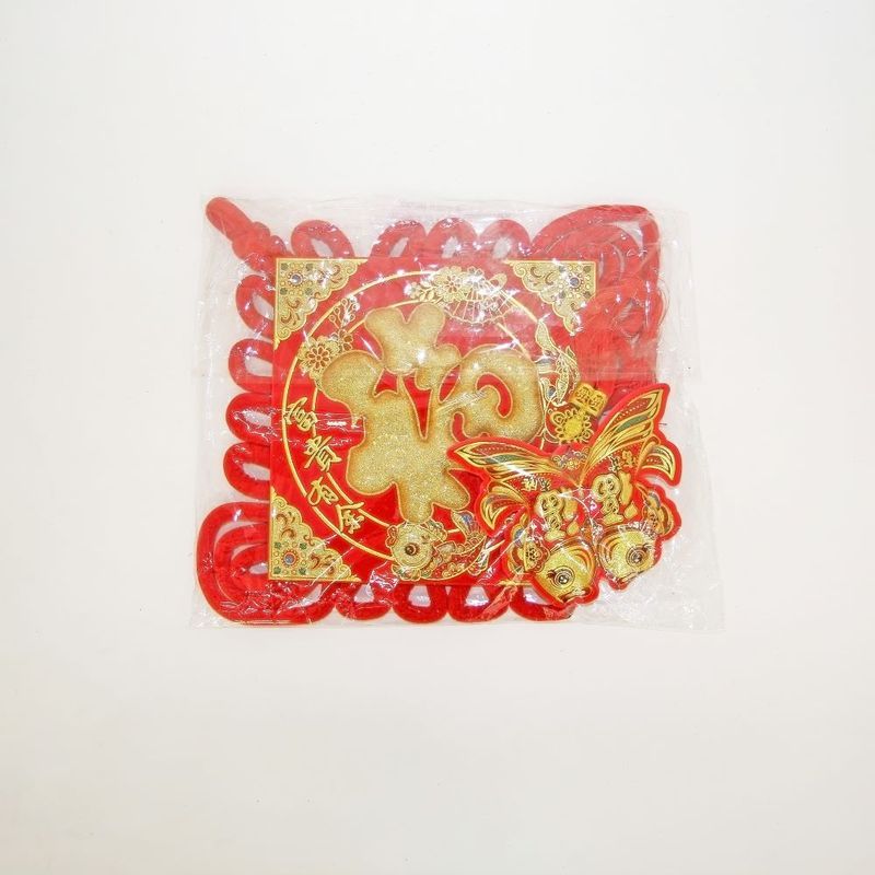 Традиционный китайский узел в форме ромба с символичным дизайном. Яркое сочетание красного бархата и золотых элементов создает эффектный акцент в интерьере.