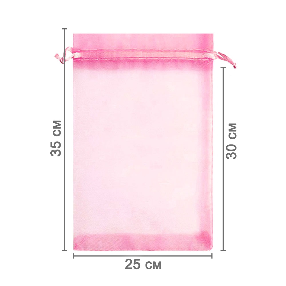 Мешочек из органзы 25 х 35 см — практичный аксессуар для упаковки крупных предметов и подарков. Лёгкая ткань подчёркивает содержимое и придаёт праздничный вид.