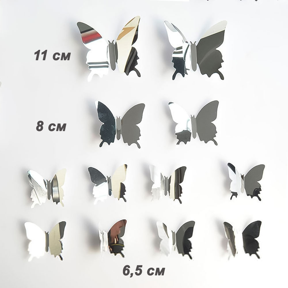 Пластиковые бабочки, двухцветные с внутреней стороны серебро, крепятся с помощью двухсторонней клейкой ленты, которая идет в комплекте.