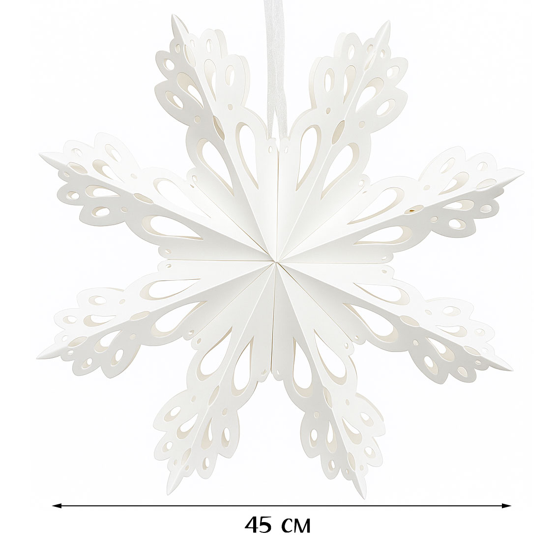 Элегантная объёмная снежинка из плотной бумаги белого цвета — изысканное украшение для зимнего интерьера, витрин, залов и новогодних фотозон. Ажурный рисунок придаёт ей лёгкость и воздушность, создавая ощущение снежной свежести и уюта.