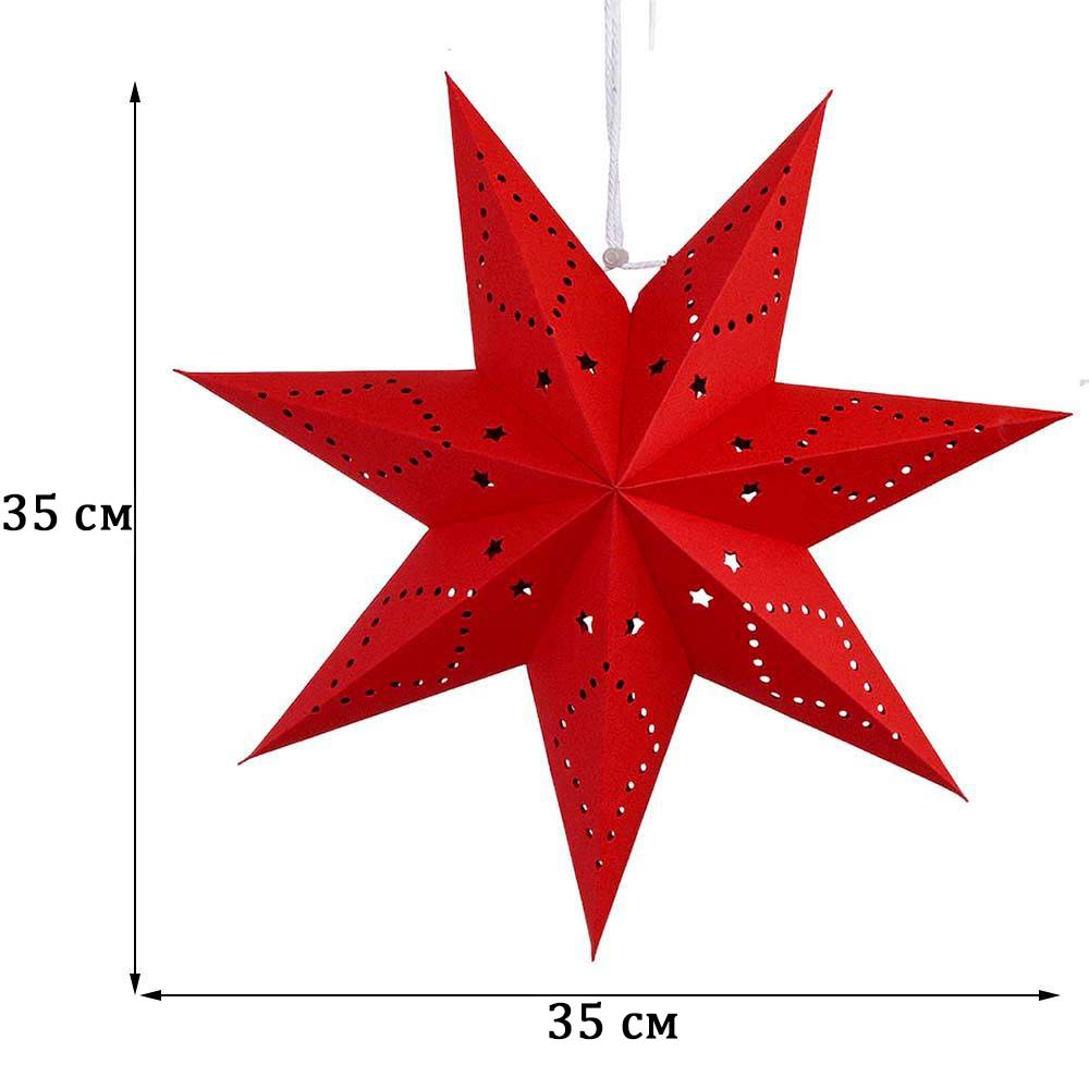 Семиконечная объемная звезда 35 см — великолепный декор из тонкого перфорированного картона. Создает красивые световые эффекты. Поставляется в сложенном виде, в комплекте шнур для фиксации объема и подвеса.